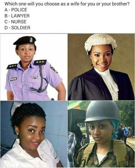 You are not choosing based on looks but on Profession okay?I will choose Nurse please..LOL